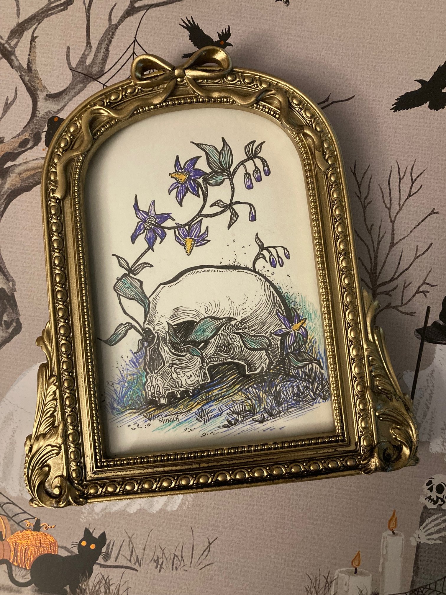 Framed memento mori illustration done in pen and ink. At its widest point the framed drawing measures approximately 6" x 7".